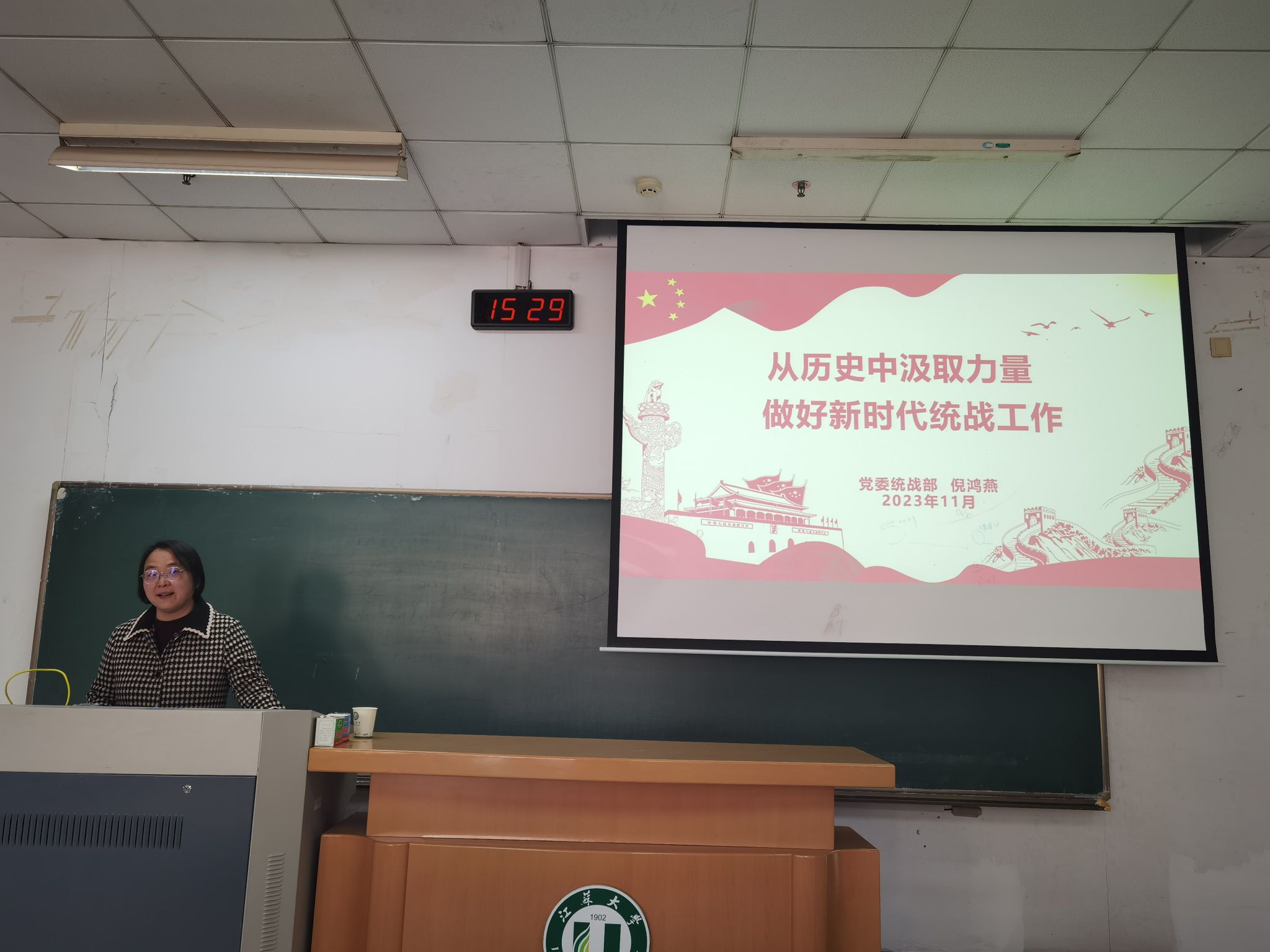 在三江楼附楼202教室举办统一战线专题讲座。本次讲座邀请到江苏大学党委统战部副部长倪鸿燕主讲,活动由bet365博彩