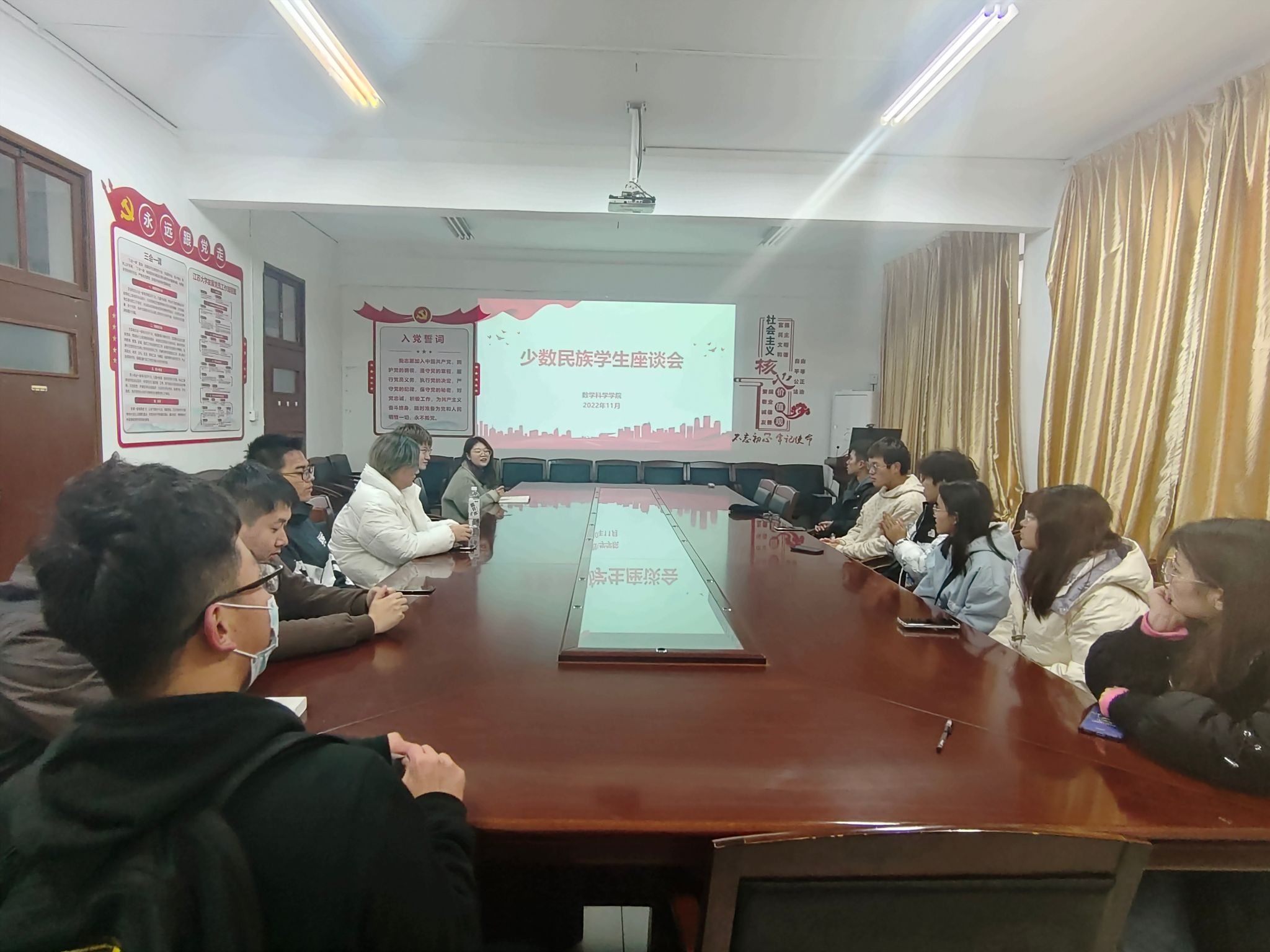 在206会议室开展少数民族学生座谈会。辅导员武启慧、朱江涛和10余名少数民族学生代表参会。
