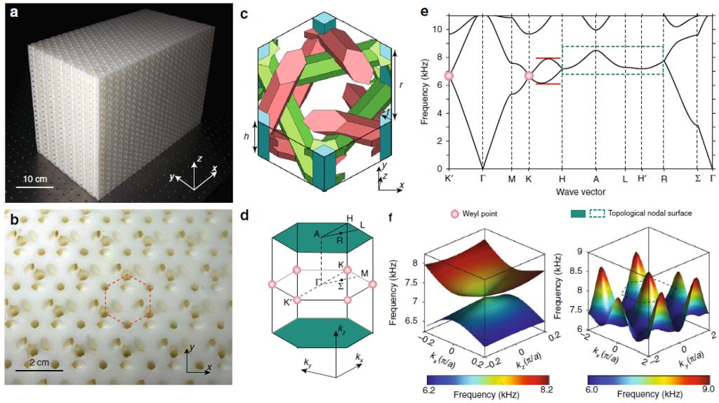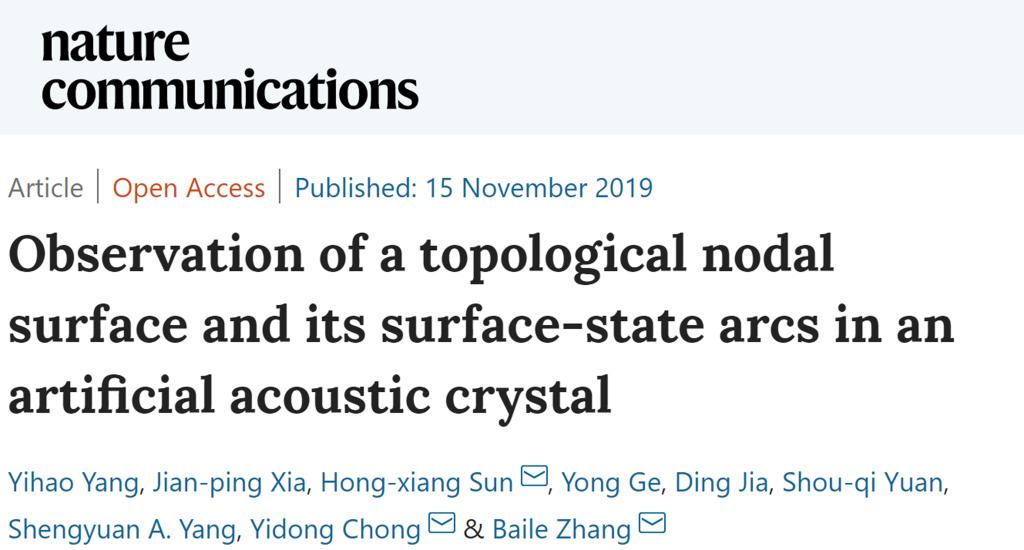 Recently, in collaboration with the group of Prof. Baile Zhang in Nanyang Technological University, the group of physical acoustics in our school has experimentally observed a twofold symmetry-enforced nodal surface in a three-dimensional (3D) chiral acoustic crystal. The research results have been published in《Nature Communications》entitled " Observation of a topological nodal surface and its surface-state arcs in an artificial acoustic crystal" (DOI: 10.1038/s41467-019-13258-3). Yang Yihao, postdoctoral fellow in Nanyang Technology University, and Xia Jianping, master in our school are the co-first authors. Prof. Sun Hongxiang in our school, Prof. Zhang Baile and Prof. Chong Yidong in Nanyang Technology University are co-corresponding authors.