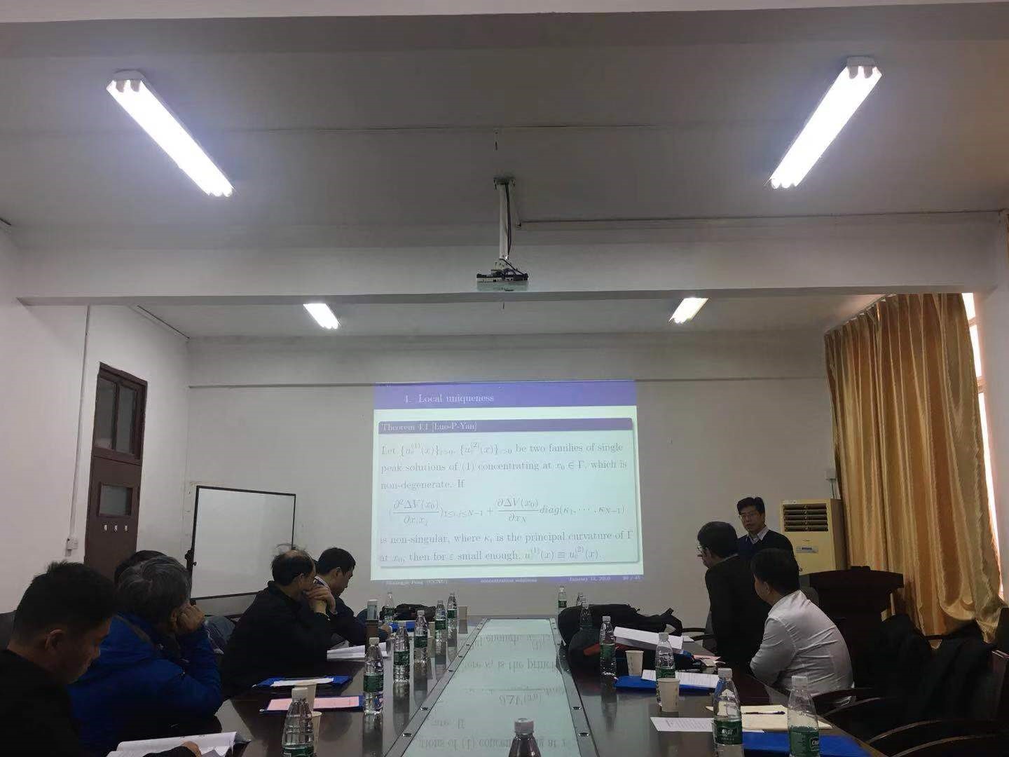 Prof. Peng Shuangjie, a recipient of the National Outstanding Youth Fund and Vice-President of Central China Normal University, gave an academic lecture on “Location and uniqueness of concentration solutions”. He introduced the latest research work on the existence and local concentration uniqueness of semi-classical Schrodinger equation solution.