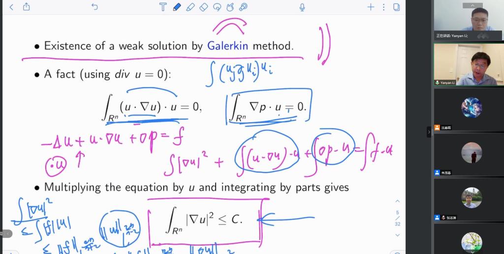 Professor Yanyan Li gave a wonderful academic report on the topic of "Regular solutions of the stationary Navier-Stokes equations on high dimensional Euclidean space", mainly explaining the regularity of weak solutions of static incompressible Navier-stokes equations in high dimensional space. First, he used the Galerkin method to illustrate the existence of weak solutions, and explained the research history of the regularity of weak solutions in low-dimensional spaces. Secondly, he introduced the latest research results on weak solutions of Navier-stokes equations in high-dimensional spaces, and elaborated on the proof idea: By first rewriting the Navier-stokes equation into a certain integral form of equation, then giving the proof of the prior estimation in the regularity theory, and finally using the classic Leray-Schauder degree theory to obtain the existence of smooth weak solutions.