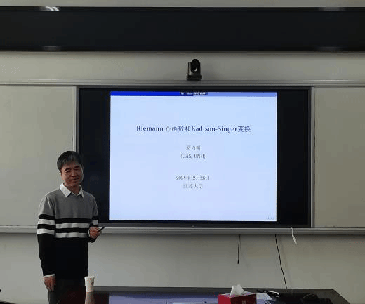 葛力明以“黎曼zeta函数和Kadison-Singer变换”为题做了精彩的学术报告。葛力明首先介绍了Kadison-Singer(KS)变换是自然数乘法结构到实数乘法半群上的乘性Fourier变换,它诱导了实数上的可积函数到复半平面上的解析函数之间的代数同构;随后讲解通过KS-变换,黎曼zeta函数的零点可以用算子的指标完全刻画,并给出诸多实例,从而算子理论为研究黎曼zeta函数和自然数的乘法结构提供了新方法。